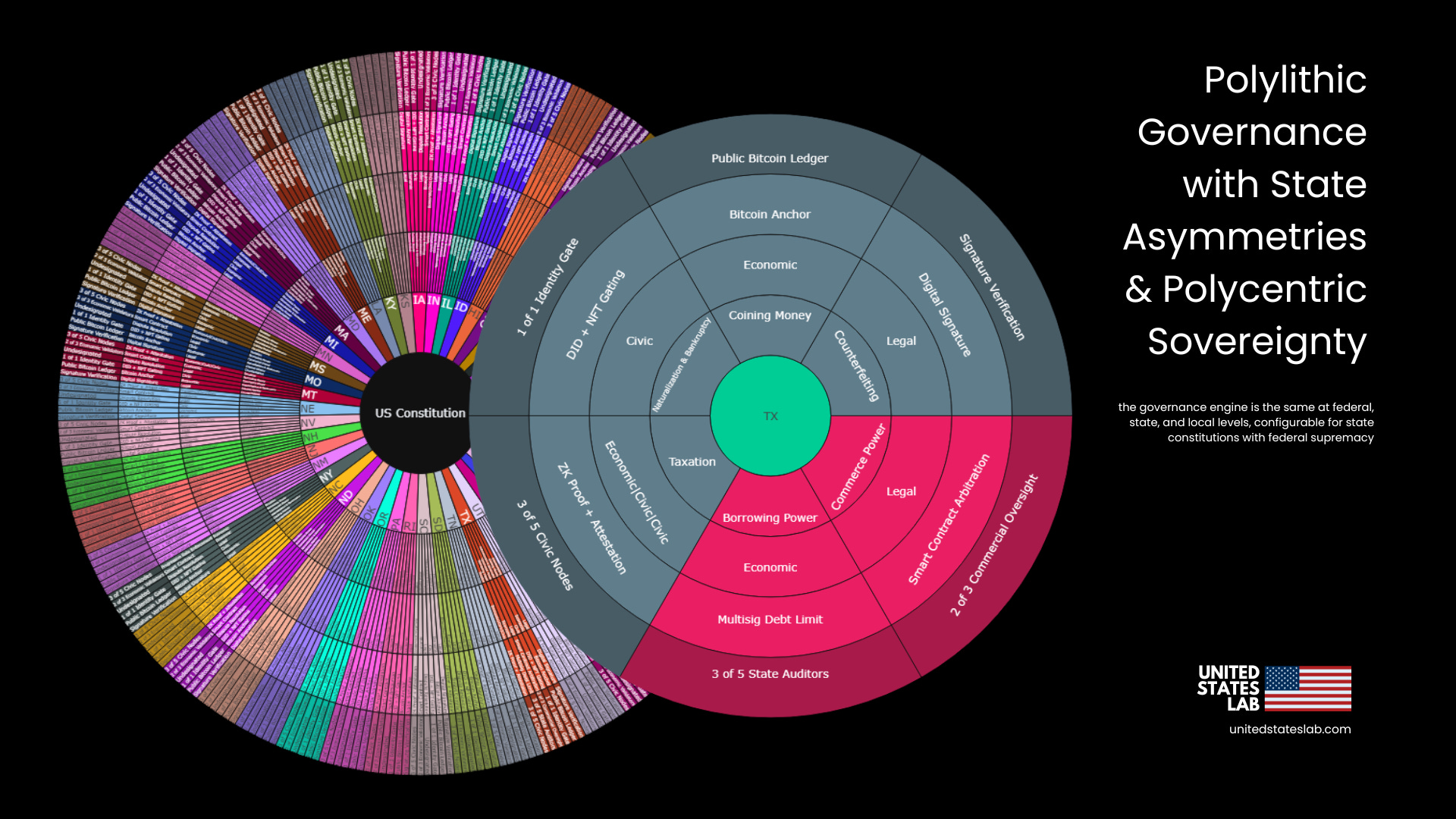 United States Lab introduces a governance architecture grounded in the proven logic of the U.S. Constitution while harnessing the technical capabilities of blockchain and zero-knowledge technologies. This design, termed Polylithic Governance, preserves the autonomy of state and local governance modules (states, counties, cities, or digital replicas) while enforcing interoperability and fidelity through a shared constitutional protocol. The model mirrors the original intent of America’s compound republic, where power is both divided and constrained, and sovereignty is layered without being diluted.